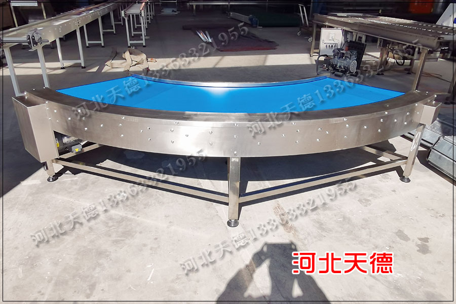 轉彎皮帶輸送機廣泛應用在食品、飲料、電子等行業(yè),可以選用較小直徑的滾筒,使轉角連接方便,很好的解決過渡問題。