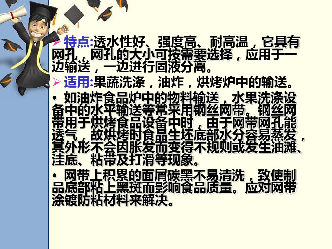 適用:果蔬清洗、油炸、烘烤爐中的輸送。如油炸食品中的物料輸送,水果洗滌設(shè)備中的水平輸送等常采用鋼絲網(wǎng)帶。鋼絲網(wǎng)帶用于烘烤食品設(shè)備中時(shí),由于網(wǎng)帶網(wǎng)孔能透氣,故烘烤食品生胚底部水分容易蒸發(fā),其外形不會(huì)因脹發(fā)而變得不規(guī)則或發(fā)生油攤,洼底粘帶及打滑等現(xiàn)象。