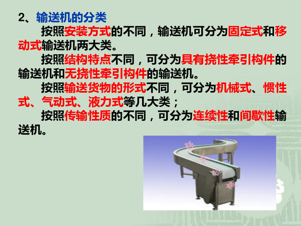 二、連續(xù)性輸送機 1、帶式輸送機。幾十米至上千米 2、螺旋式輸送機。一米以內(nèi)至十幾米 3、氣力輸送機 4、斗式提升機 三、間歇性輸送機 根據(jù)輸送機有無動力源,可分為重力式和動力式兩大類。 重力式輸送機根據(jù)滾動體的不同,可分為滾輪式滾筒式和滾珠式三種形式。 動力式輸送機以電動機為動力,根據(jù)驅(qū)動介質(zhì)的不同,可分為鏈條式、輥子、平帶輸送機和懸掛式輸送機等。