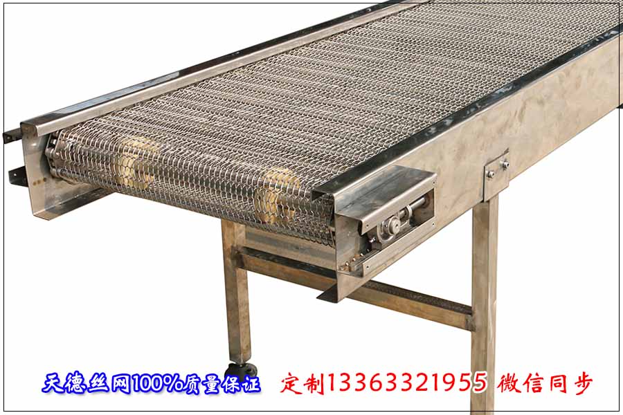 下面是此網(wǎng)帶輸送機(jī)的詳細(xì)數(shù)據(jù): 網(wǎng)帶輸送機(jī)的凈寬度為600mm(輸送帶的使用面積),輸送機(jī)平面的尺寸為1824mm(其余的作為提升),提升的高度為1200mm,總長(zhǎng)度為3995mm。機(jī)身板厚4.5mm材質(zhì)為碳鋼,所有底腿加橫支撐,鏈輪與傳動(dòng)軸、軸承座全部為碳鋼。電機(jī)使用皮帶輪電機(jī)功率為1.5kw,減速機(jī)速比1:80, 配帶變頻器。 網(wǎng)帶輸送機(jī)使用的鏈條節(jié)距為50.8mm,不銹鋼絲直徑為2mm,網(wǎng)孔為10mm*15mm(凈孔),不銹鋼輸送帶桿直徑10mm,間距101.6mm(兩節(jié)鏈條一根 ),材質(zhì)為耐腐蝕304不銹鋼。 以上是客戶訂購(gòu)的詳細(xì)數(shù)據(jù),在這里希望我的分享能給大家?guī)?lái)幫助。