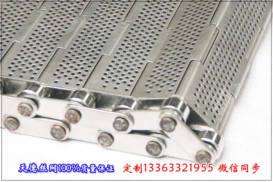 一般的鏈板表面是不需要進行打孔處理的,在輸送鏈板的表面進行打孔或者是添加側(cè)擋板以及橫向擋板等要求都屬于特殊加工的要求,如果需要在鏈板金屬輸送帶的表面進行加工一定要與銷售人員工溝通清楚,防止報價的金屬輸送帶與您所需要的有所不同。鄭總訂購的蘋果清洗分揀不銹鋼輸送帶的總寬度為820mm,鏈板的板厚為1.2mm,沖孔直徑根據(jù)鄭總的要求做 的是5mm,串桿的加工直徑為6mm,鏈板兩側(cè)的傳動鏈條的節(jié)距為38.1mm,因為長期在水中使用材質(zhì)為全部304不銹鋼。