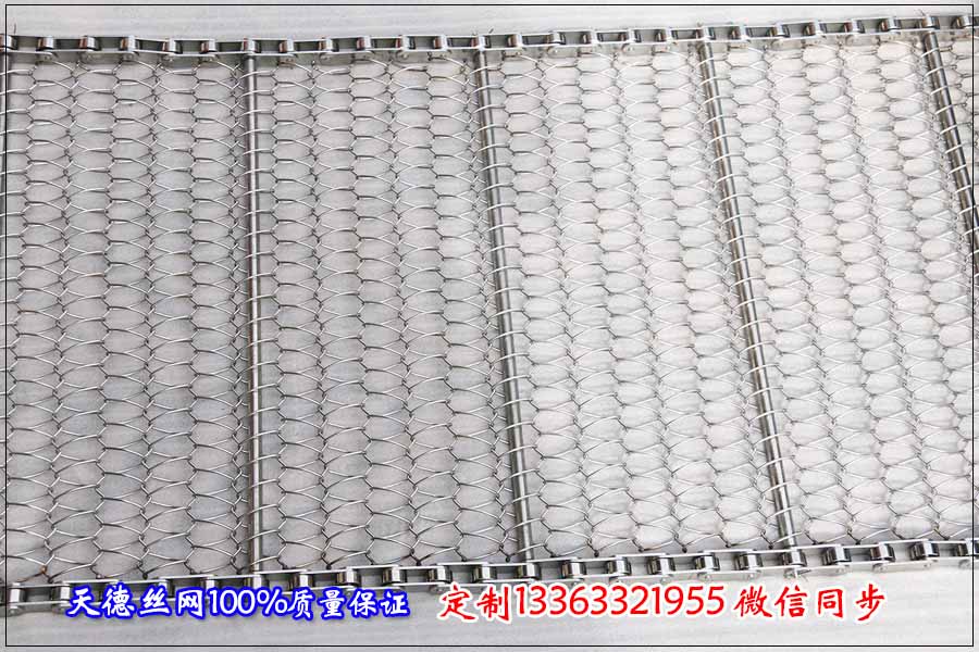 今天上午湖北咸寧客戶來電咨詢鏈條式不銹鋼網(wǎng)帶,用來蒸煮熱干面,干面如同蕨根粉般粗細(xì),在經(jīng)過一番的了解后,定制規(guī)格為: 食品輸送網(wǎng)帶我們采用不銹鋼304材質(zhì),這樣不會影響食品的質(zhì)量,干凈衛(wèi)生,能夠保證面條的原有鮮味。面條輸送網(wǎng)帶采用的結(jié)構(gòu)形式為鏈條式不銹鋼網(wǎng)帶,鏈條網(wǎng)帶總寬為40公分,長為20米,每米輸送網(wǎng)帶上面的載重量在10公斤以下,根據(jù)輸送使用絲徑為1.0毫米,根據(jù)輸送面條的大小不銹鋼網(wǎng)帶的孔定制為5*10毫米,不銹鋼鏈條網(wǎng)帶的節(jié)距為25.4毫米,不銹鋼圓棒支撐桿直徑為6毫米,圓棒之間的間距為150毫米,材質(zhì)選用全部304不銹鋼。